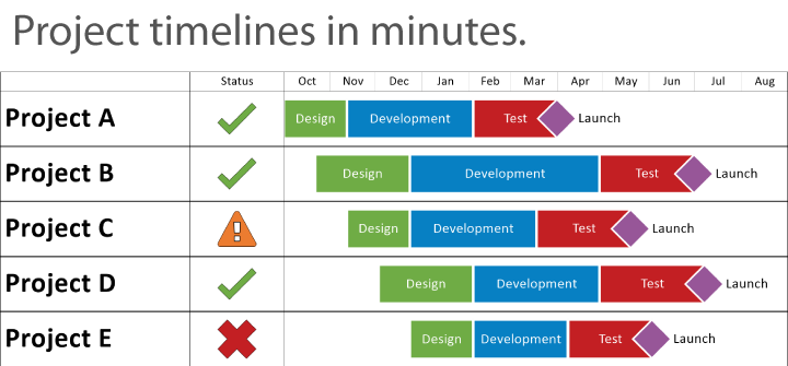 如果可以编辑 PowerPoint 幻灯片,则可以编辑 OnePager Express 甘特图。您还可以设置规则以自动分配颜色和样式。 |